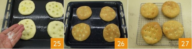 And season with salt flakes 25. Bake the flatbreads in a preheated static oven at 428°F for 12-13 minutes on the middle rack. Once ready, the soft flatbreads will be beautifully golden on the surface, remove them from the oven 26, let them cool on a rack 27, and then enjoy them!