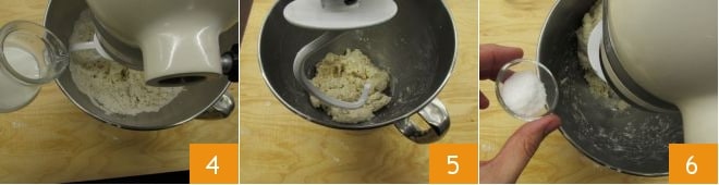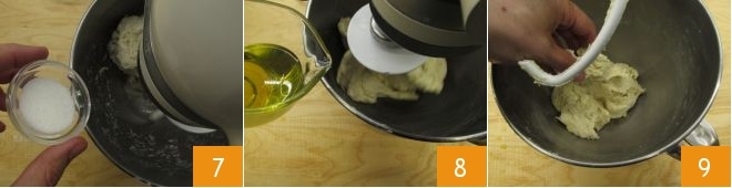 the salt 7 and the olive oil in a stream 8. Knead until the mixture is combined and pulls away from the sides 9.