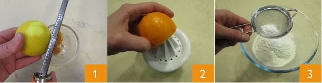 To prepare the soft lemon and orange cookies, first melt the butter over very low heat, then let it cool slightly. Next, wash and dry the citrus fruits, grate the peels being careful not to take the more bitter white part 1. Continue by squeezing the juice from the two citrus fruits and obtain 1/6 cup from each; set aside 2. Place a sieve in a bowl and sift the flour and baking powder 3.