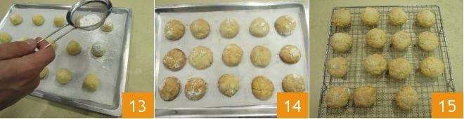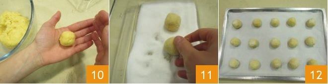 After the time needed to compact the dough, form balls about 3/4 oz each, obtaining about thirty pieces 10 that you can then roll in granulated sugar so they are well covered 11. Arrange the cookies on a baking sheet lined with parchment paper, keeping them spaced apart 12.