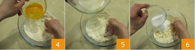 Start kneading by hand while adding the room temperature eggs 4 and the melted butter, now cooled 5, then the granulated sugar 6,