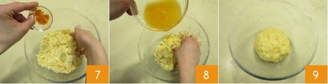 the citrus peels 7 and the lemon and orange juice 8. Continue kneading until you get a soft and compact ball, cover with plastic wrap and let it rest in the refrigerator for about an hour 9.