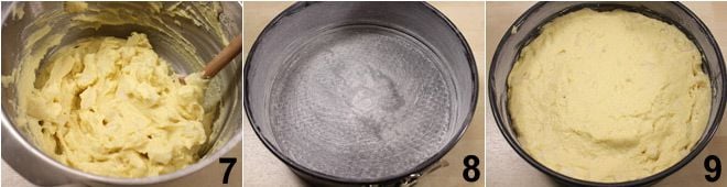 and blend them into the batter 7. Grease and flour a 9.5-inch springform pan 8, pour the cake batter into it, and level it well with a spatula 9. Then bake the cake at 350°F (static oven) for 50-70 minutes, until a wooden skewer inserted in the center of the cake comes out dry. If the cake becomes too dark on the surface during baking, cover it with a sheet of aluminum foil. Remove the soft ricotta and pear cake from the oven, let it cool slightly, unmold it, and sprinkle it with powdered sugar before serving!