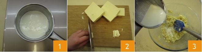 To prepare the soft white chocolate tart, the first thing to do is make the ganache, which must rest in the refrigerator for at least a couple of hours. Heat the cream in a saucepan over very low flame 1 and quickly chop the white chocolate 2. Then transfer it to a bowl and gradually pour in the boiling cream 3, stirring with a spatula until the chocolate is completely melted.