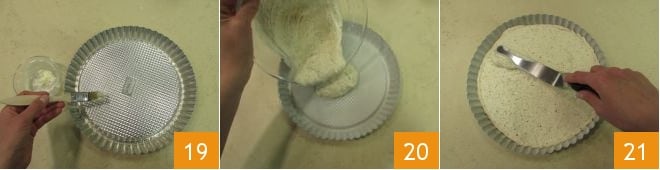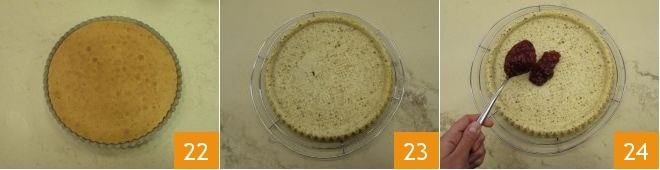 Once baked, remove the soft tart from the oven 22 and let it cool before removing it from the mold by flipping it onto a wire rack 23. Then place the jam in the cavity of the dessert 24