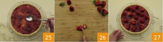 and spread it with the back of a spoon to cover the entire surface 25. Take the strawberries, remove the stem by cutting it with a small knife to create a flat base 26 and place them on the tart 27.