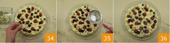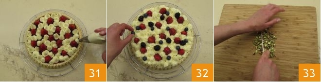 Decorate the tart first with the pistachio ganache, covering almost all the empty spaces, and then with the white one, thus covering the entire surface of the cake 31 so that the jam is no longer visible. Decorate with fresh berries 32. Then coarsely chop the pistachios 33