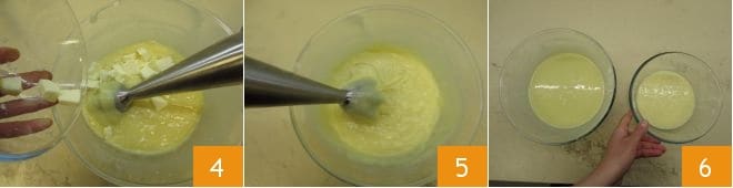 Then add the softened butter 4 and emulsify everything with an immersion blender until completely incorporated 5. At this point, take about 300 g of ganache and set it aside 6.