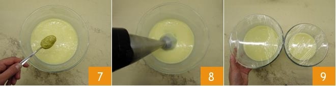 Add the pistachio paste to the remaining ganache 7. Emulsify again with the blender to incorporate it 8 and cover both bowls with plastic wrap 9. Place in the refrigerator for 2 hours until well crystallized.