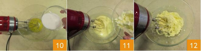 Meanwhile, make the base of the soft tart. Pour the egg into a bowl and, using electric beaters, incorporate the sugar 10. Only when the mixture is well whipped can you add the softened butter, cut into cubes 11 and continue beating until you get a smooth and frothy cream 12.