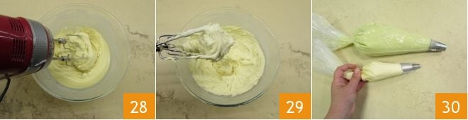 Take the ganache from the fridge and whip both with electric beaters (28-29). Then transfer the white chocolate ganache into a piping bag fitted with a 1 cm star nozzle and the pistachio one into a piping bag fitted with a 18 mm plain nozzle 30.