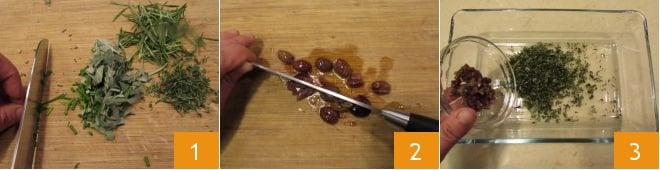 To prepare the sole, first fillet the two soles. To help you with this operation, consult our guide How to clean the sole From each sole, you will get 2 fillets. For the rolled sole with herbs and olives, start by chopping the aromatic herbs required by the recipe: chives, sage, rosemary, thyme, and parsley 1. Drain the olives from their preserving oil and chop them with a knife 2, then place the herb mixture and olives in a baking dish 3 and mix.