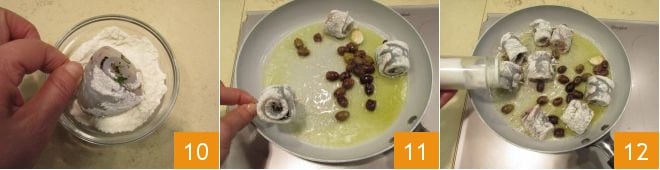 Let it flavor for a couple of minutes, then flour the sole rolls 10 and lay them in the pan 11 and salt them 12.