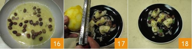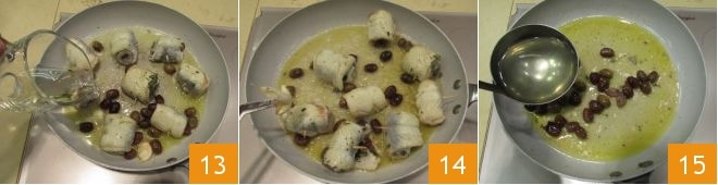 Sauté for 2-3 minutes, then deglaze with white wine 13, pepper, and let cook for another 3-4 minutes over low heat. When cooking is finished, remove the garlic with kitchen tongs 14 and transfer the rolls to a serving dish. In the same pan, pour a ladle of hot water or vegetable broth 15,