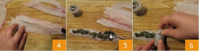 Take the sole fillets and divide them in half 4, obtaining 8 pieces. Take each half and distribute the mixture of herbs and olives on top 5, then roll up the fillet 6
