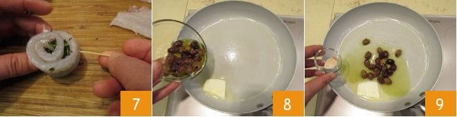 And secure the roll with a toothpick 7. Place the butter in a pan and let it melt over moderate heat, also add the whole pitted Taggiasca olives 8 and the garlic clove 9.