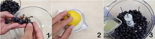 To make the strawberry grape sorbet, remove all the grapes from the bunches and place them in the cup of a blender 1. Squeeze half a lemon 2 and add the juice to the grapes 3, then blend everything until it turns into a puree.