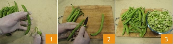 For the sautéed broad bean peels, start by putting a pot with water on the stove where you will blanch the peels, then proceed to clean the pods by removing the central filament with the help of a small knife 1; remove the two ends 2 and do the same for all, keeping them separate from the broad beans 3 which you can use for other recipes, such as the broad bean salad. If you prefer, you can wear gloves to clean the broad beans, this way you'll avoid soil residues getting under your nails.