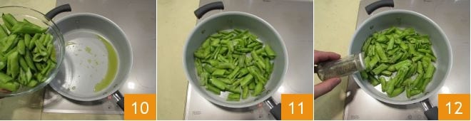 when the oil is hot, remove the garlic and add the cut peels 10, letting them season for a few minutes on high heat 11 and adjust with salt and pepper 12.