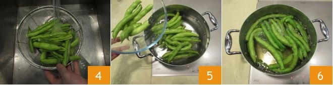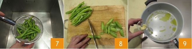 Rinse the broad bean pods under running water to remove any impurities 4, then immerse them in the boiling water 5, letting them cook for 5 minutes 6, just enough time to slightly soften them. Keep the cooking liquid as you will need it later to deglaze the peels.