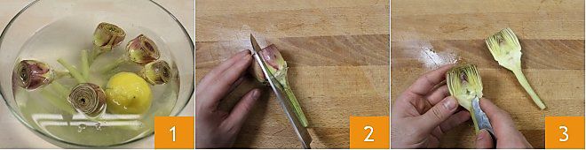 To prepare spaghetti with white artichoke ragù, start with the How to clean artichokes, removing the outermost leaves and keeping only the heart. Remember to always keep the artichokes in acidulated water with lemon during cleaning, to prevent them from turning black 1. Once cleaned on the outside, cut the hearts in half 2 and remove the dry and hairy part, the choke of the artichoke 3.