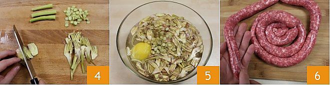 Cut both the stems and the artichoke into thin slices 4 and place them in water and lemon to prevent browning 5. Take the sausage and, with a small knife, slit the skin 6, remove it and