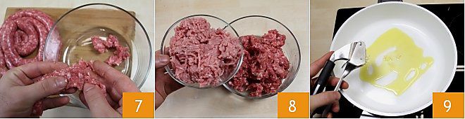 crumble the sausage well in a bowl 7. Add the minced veal to the sausage 8 and mix the two meats with a fork. In a non-stick pan, add the oil and a crushed garlic clove 9