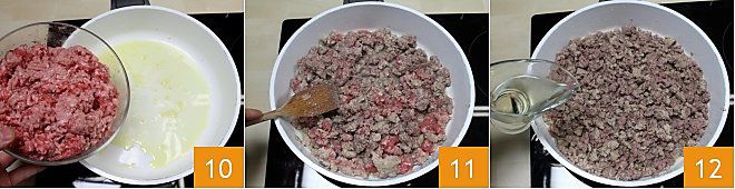 and, after the garlic turns golden, add the meat 10 and cook for 15 minutes over medium heat, stirring occasionally with a wooden spoon to ensure even cooking 11. Deglaze with white wine 12 and let the wine evaporate.