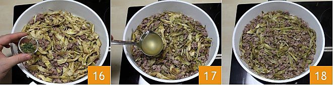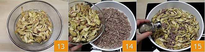 Drain the artichokes 13 and add them to the ragù in the pan 14. Continue to cook over medium heat for 15-20 minutes until the artichokes become tender; season with salt and pepper 15;