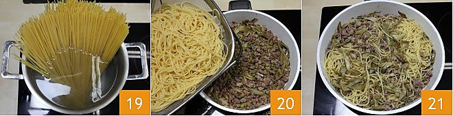 Meanwhile, cook the spaghetti in plenty of salted boiling water 20. When al dente, drain them and add them directly to the ragù in the pan 20; mix everything carefully, making sure not to break the artichokes while stirring. To make the sauce thicker, add another ladle of broth and sauté the pasta in the pan for a couple of minutes: your spaghetti with white artichoke ragù is ready 21. Enjoy your meal!