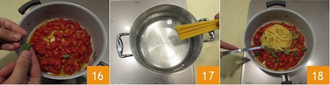 Roughly tear some well-cleaned and dried basil leaves 16 and while the cherry tomatoes are cooking, boil the pasta in a pot with plenty of salted boiling water 17. When it is al dente, drain it directly into the pan with the cherry tomatoes 18.