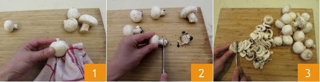 To prepare spaghetti with cherry tomatoes and champignons, start by cleaning the mushrooms. Remove the earthy part of the stem by scraping it with a small knife. If you prefer, if there isn't too much soil on the mushrooms, you can perform the operation with a small brush or a slightly damp cotton cloth and pass it over the entire surface 1. Once cleaned, make a clean cut at the bottom of the stem to remove it 2 and slice them thinly lengthwise 3.