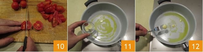 Move on to the tomatoes: cut them into quarters 10 and heat a bit of oil in a non-stick pan. Brown a clove of garlic in it 11, and as soon as the oil is flavored, remove it 12.