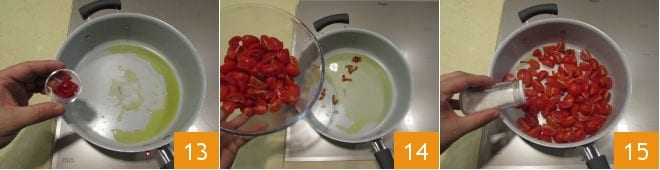 Take a chili pepper, remove the internal seeds, and slice it thinly, then add it to the pan 13 along with the cherry tomatoes 14. Adjust the salt 15 and pepper. Cook the cherry tomatoes on moderate heat for about 10 minutes.