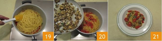 Mix it with the seasoning 19 and add the mushrooms as well 20. Mix the ingredients well and plate your spaghetti with cherry tomatoes and champignons 21.
