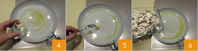 Take a non-stick pan and drizzle it with a bit of oil. Brown a clove of garlic 4. Once it has a golden color, remove it 5. Then add the champignons to the pan 6.