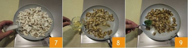 Adjust the salt 7 and pepper and cook the champignons on low heat for about 10 minutes, until they have completely released their water. Then deglaze with the wine 8 and let it evaporate. Finally, add the parsley 9, stir and set aside.