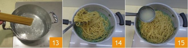 In the meantime, cook the whole wheat spaghetti 13 and when they are al dente, transfer them to the pan with ricotta and spinach 14, then add a ladle of spaghetti cooking water to prevent the pasta starch from drying out the dressing too much 15.