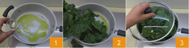 To prepare spaghetti with ricotta and spinach, start by putting water on the stove to boil the pasta, and when it comes to a boil, salt it to taste. Then begin by thoroughly washing the spinach, pat them dry with kitchen paper. In a large pan, pour the extra virgin olive oil and the whole peeled garlic clove 1. Let the garlic brown, then add the spinach 2 and cover with a lid 3; a few minutes of cooking will suffice.