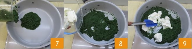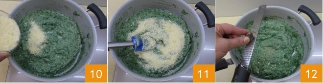 Transfer the puree to a large high-sided pan 7 and add the ricotta, keeping the heat very low 8, mix with a spatula to combine the ingredients 9.