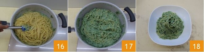 Mix to flavor and combine the ingredients (16-17) and serve the spaghetti with ricotta and spinach as soon as they are ready 18!