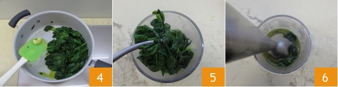 This will result in soft spinach but not mushy. Then remove the garlic clove 4 and transfer the spinach to the tall glass of an immersion blender 5, then blend them 6. You should obtain a puree.