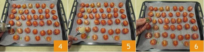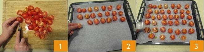 To prepare the spaghetti with sage and walnut pesto, start by making the confit cherry tomatoes. Wash them and cut them in half 1; then place them with the pulp side facing you on a baking sheet lined with parchment paper 2, spacing them well apart. Season with oil and salt 3