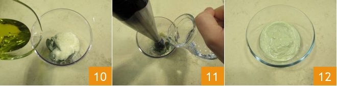 Season with a pinch of salt and pepper and add the oil 10. Start blending with an immersion blender, pouring in a thin stream of water 11 until you get a smooth and homogeneous pesto, which you'll transfer to a small bowl 12.