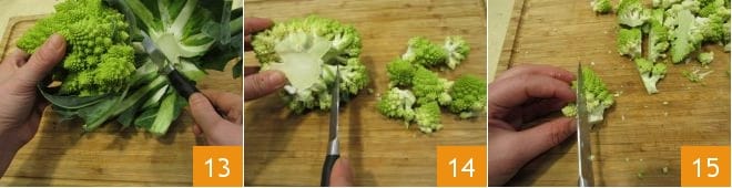 At this point, place a pot full of water on the stove, salted to taste, and proceed to clean the Roman cauliflower: remove the base 13 and with a knife separate the florets 14. If they are too big, cut them in half 15.