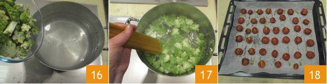 When the water starts to boil, add the broccoli 16 and cook for about 7 minutes; then add the spaghetti and continue cooking for another 8 minutes 17. At this point, your confit cherry tomatoes will be ready, take them out of the oven 18