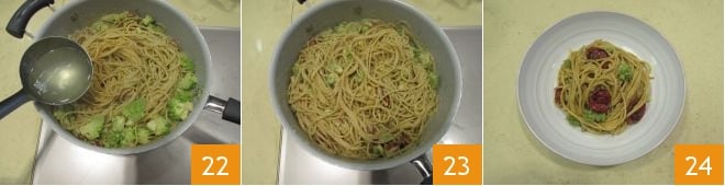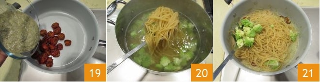 and transfer them to a pan together with the pesto 19. As soon as the pasta is cooked but still al dente, drain it, reserving the cooking water 20. Transfer it to the other pan with the pesto, also adding the broccoli 21,