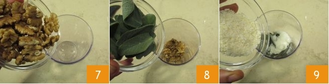 About 40 minutes before the tomatoes finish cooking, start preparing the pesto. Pour the walnuts into a blender cup 7, the well-washed and dried sage leaves 8, and the two types of cheese 9.
