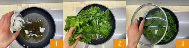 To prepare the spanakopita, start with the filling: wash the spinach thoroughly and dry them. Then clean an onion and slice it. Toss it into a large pan where you have slightly heated a drizzle of oil 1. After a few moments, you can already add the spinach 2, salt to taste, stir and cover with a lid. They should wilt, which will take a few minutes.