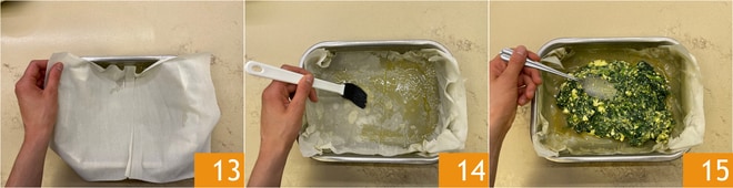 Brush a 9.5x6.5 inch (2.5 inches high) baking dish with a little oil 10, then place a sheet of phyllo dough on the bottom 11 and brush again with oil 12.